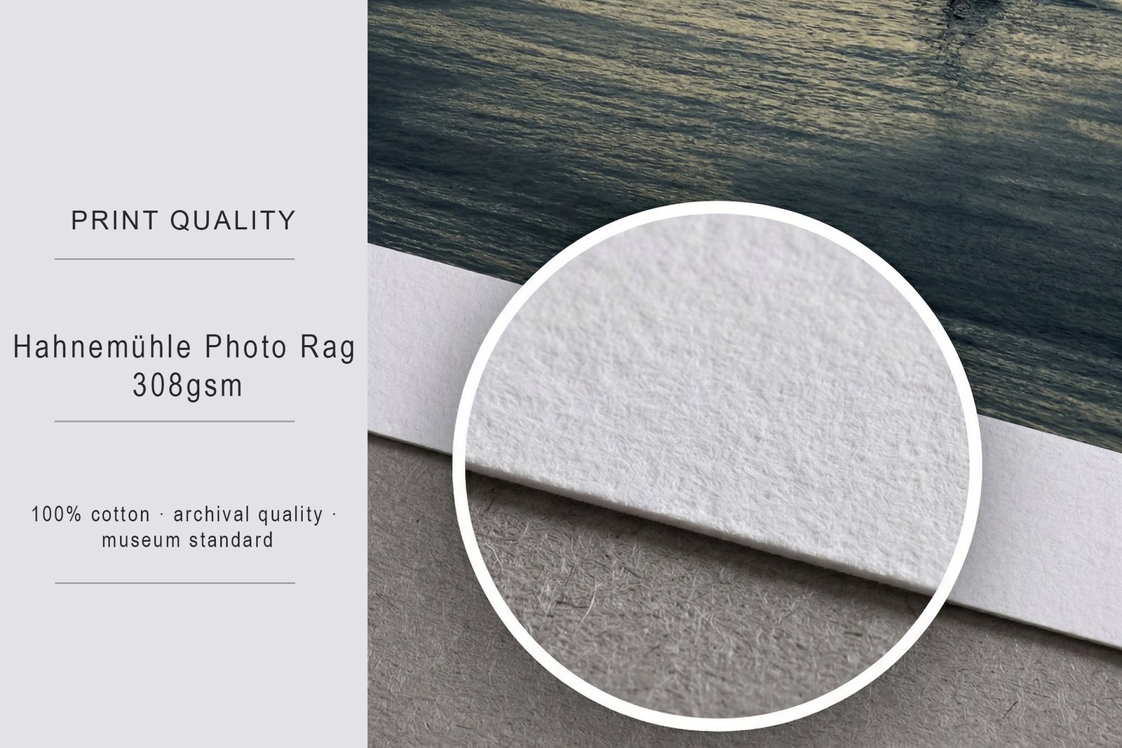 This is a fine art giclée print, produced on Hahnemühle Photo Rag — a museum-quality cotton paper with a warm, smooth surface that holds shadow detail and tonal range with exceptional fidelity.