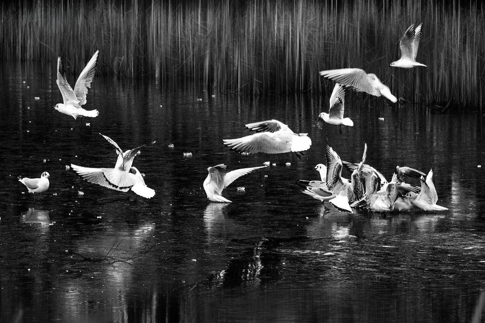 Black and white was the only choice. Colour would have pulled the eye toward the wrong things — the green of the reeds, the grey of the sky. Strip it back, and what remains is the choreography itself. The way one bird catches the air just as another hits the ice. The ripple of wings across the frame. The single gull in the top right corner, already gone, already somewhere else.